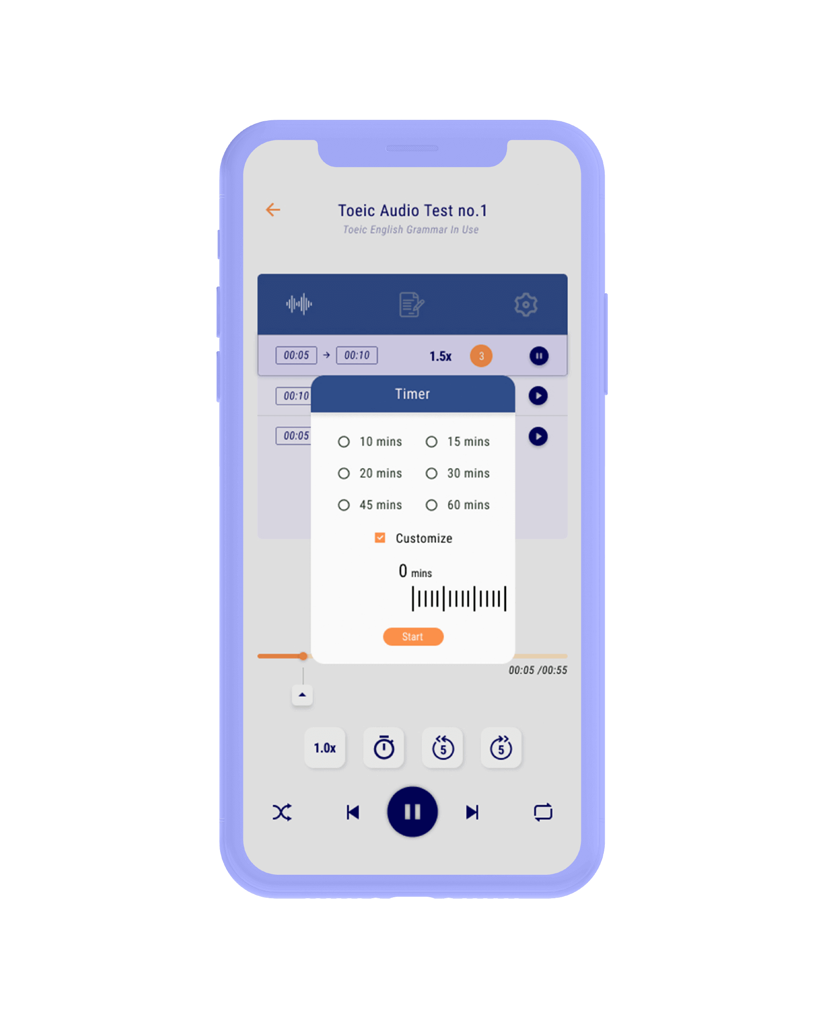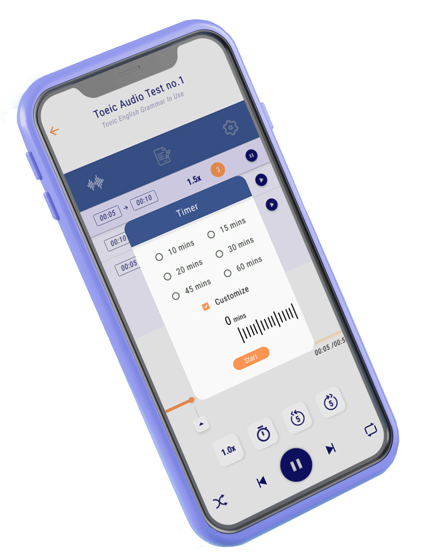 Hẹn giờ tắt ứng dụng. Bạn sẽ không phải lo lắng về việc điện thoại của mình sẽ hết pin khi luyện nghe trước khi ngủ.